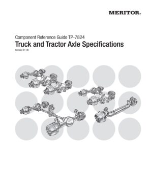 This document is the Meritor Component Reference Guide (TP-7824), which details technical specifications and model nomenclature for Meritor truck and tractor axles, transfer cases, and drivelines. All capacity ratings and applications are subject to engineering approval, and non-approved uses may void warranties.