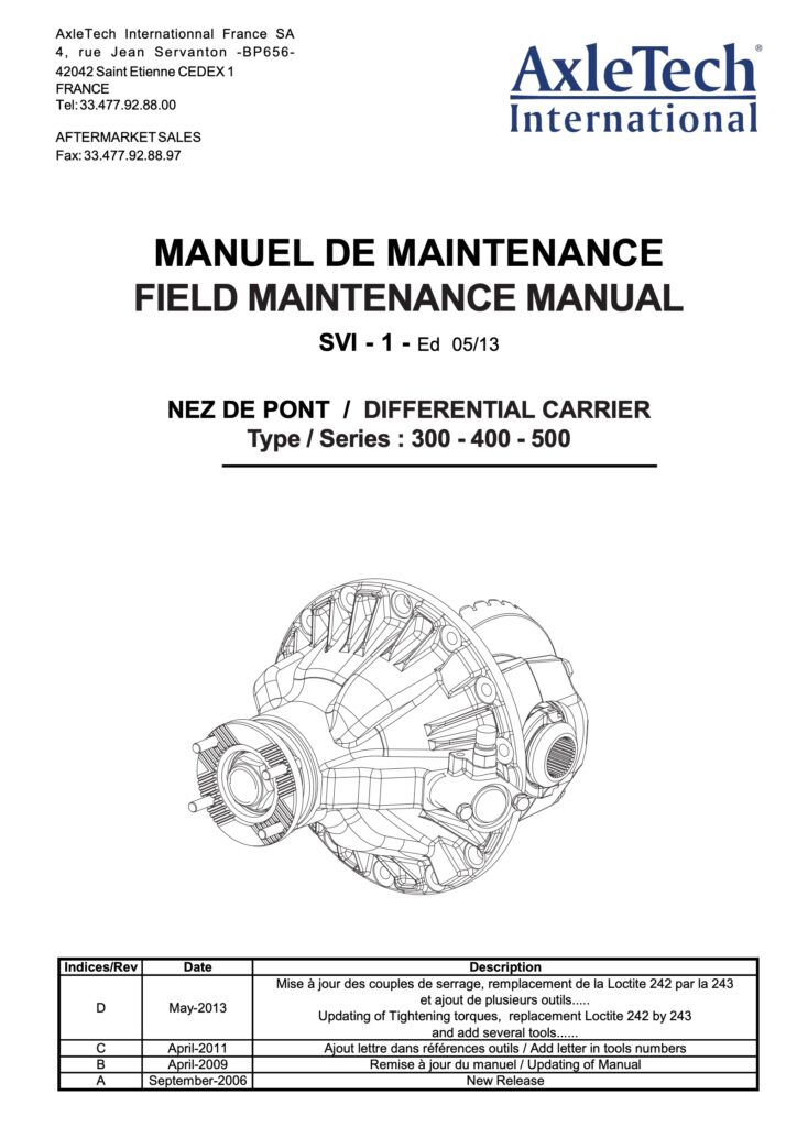 This maintenance manual provides comprehensive instructions for the service and repair of AxleTech International 300, 400, and 500 Series Single Reduction Carriers. These heavy-duty carriers are utilized in planetary axles and may include a Driver-Controlled Main Differential Lock (DCDL). 1. Key Technical Specifications Accurate assembly and adjustment are critical for operational life: 2. Core Assembly …