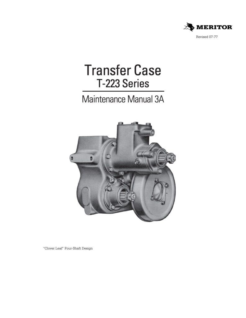 This maintenance manual provides comprehensive instructions for the service, repair, and overhaul of the Meritor T-223 Series Transfer Case. The T-223 is a single-speed, three-shaft unit designed for heavy-duty applications, featuring an optional front-axle declutch mechanism. 1. Core Component Specifications Successful assembly and maintenance depend on adhering to specific technical tolerances: 2. Key Maintenance Procedures …